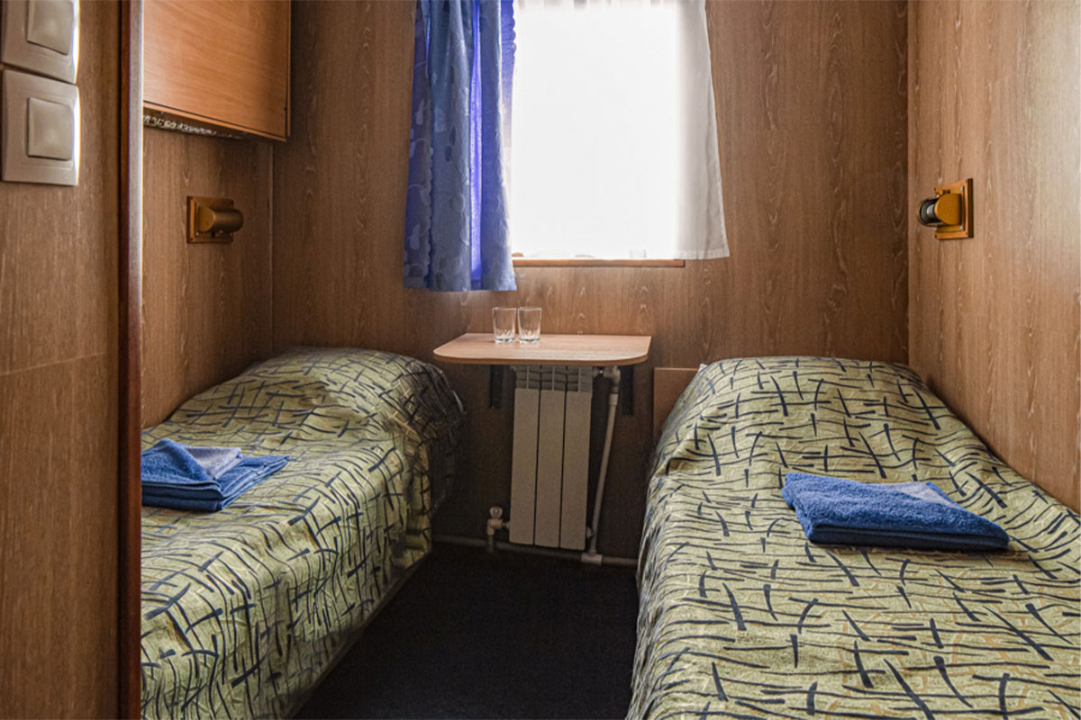 Приглашаем в речной круиз на комфортабельном теплоходе-пансионате «Александр Невский». К услугам туристов каюты со всеми удобствами (душ, туалет, раковина) и каюты с частичными удобствами (раковина). Все каюты прошли модернизацию, во время которой были сохранены ретро-стиль и цветовая гамма, в оформлении использовано дерево и начищенная латунь. Во время модернизации полностью заменены мебель, обшивка стен и сантехника. Во всех каютах предусмотрена судовая радиотрансляция.