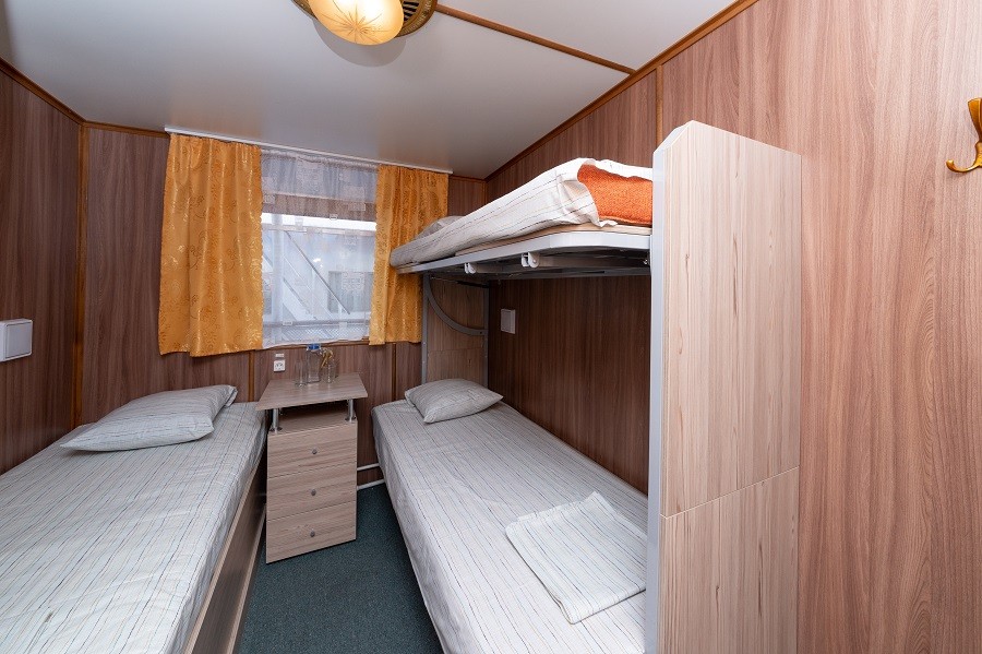 На борту для размещения туристов представлены разные категории кают: от двухкомнатных «Люксов» до четырехместных кают с частичными удобствами. Для соло-путешествий есть большое количество одноместных кают с частичными удобствами.