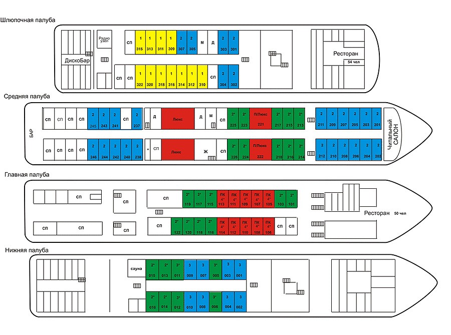 № 001 - 004, 007 - 008, 010 - трехместная каюта, со всеми удобствами (раковина, душ, туалет), расположенная на нижней палубе. Рассчитана на размещение двух-трех человек. В каюте: 3 спальных места (2 нижних, верхняя полка откидывается), холодильник, шкаф для одежды, радио, эл.розетка, иллюминаторы. S=10 кв.м.