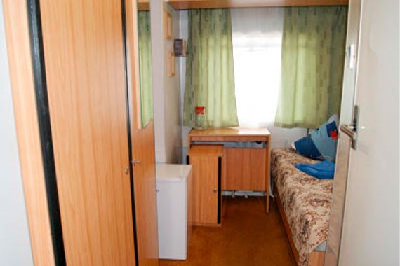 №102, 104 - одноместная каюта со всеми удобствами (раковина, душ, туалет), расположенная на главной палубе. В каюте: односпальная кровать, холодильник, шкаф для одежды, радио, эл.розетка, окно. S=7,50 кв.м.