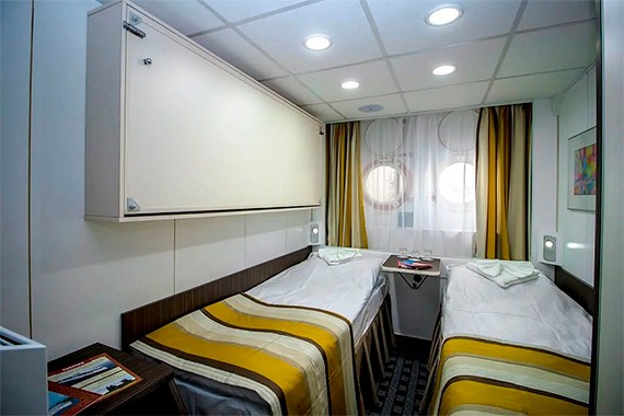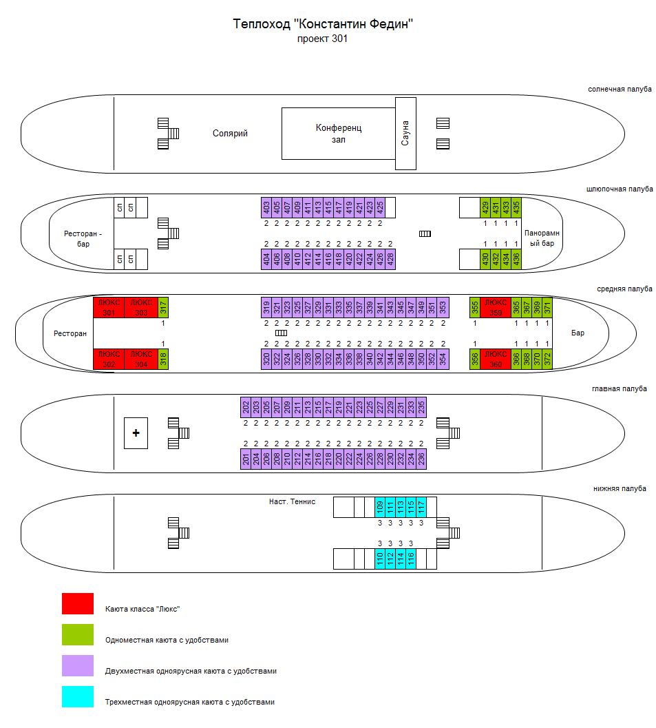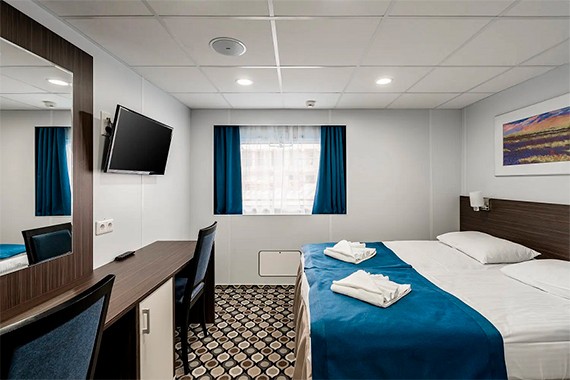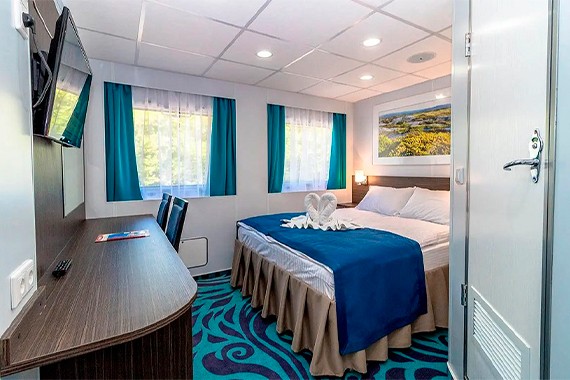 Для комфортного размещения (от 1 до 4 человек) гостям предлагаются различные категории кают увеличенной площади: 6 кают «Люкс»; 40 кают «Делюкс»; 40 двухместных кают; 10 трехместных двухъярусных кают и 20 одноместных кают. На борту представлены каюты теплохода разных категорий: «Люкс», «Делюкс», одноместные, двухместные и трехместные двухъярусные каюты. Каюты оборудованы всем необходимым: шкаф для одежды, радио, телевизор, кондиционер, холодильник, душ, фен, санузел, обзорное окно (или иллюминатор), розетка 220 V. Ежедневное пополнение бутилированной воды в каюте – 1 бутылка (0,5 л.) на человека в день.
