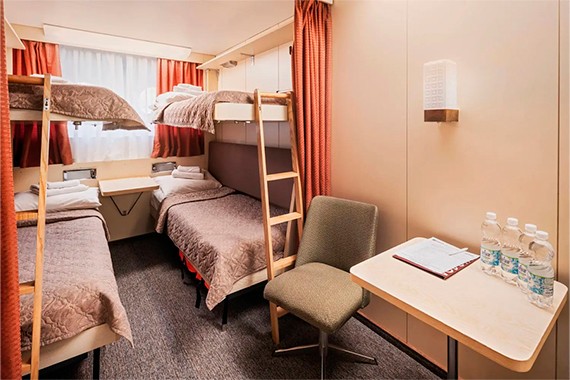 Четырехместная двухъярусная каюта со всеми удобствами, расположенная на нижней палубе. Площадь каюты ≈ 12,8 м². В каюте: четыре спальных места (два внизу, два вторым ярусом), шкаф для одежды, холодильник, телевизор, фен, радио, ванная комната (душ, туалет, раковина), кондиционер, два иллюминатора, розетка 220V.
