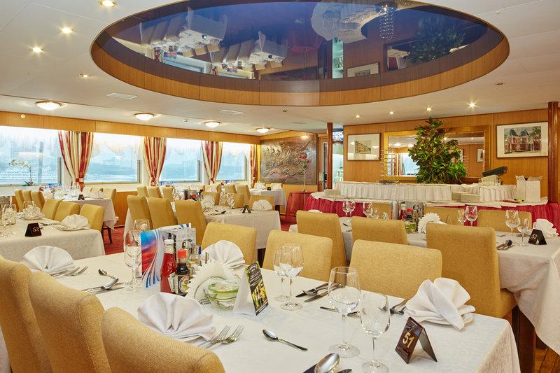 Гостям судно положено трехразовое питание. Оно включает завтрак, обед (выборное меню из 2-х первых блюд, 3-х вторых блюд, из которых можно выбрать одно вегетарианское и один из двух десертов), ужин (выборное меню из 2-х блюд и выбор одного из двух десертов), предусмотрены детские стульчики в ресторане.