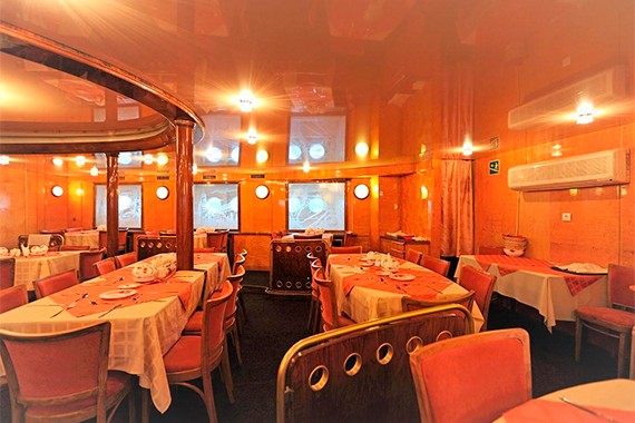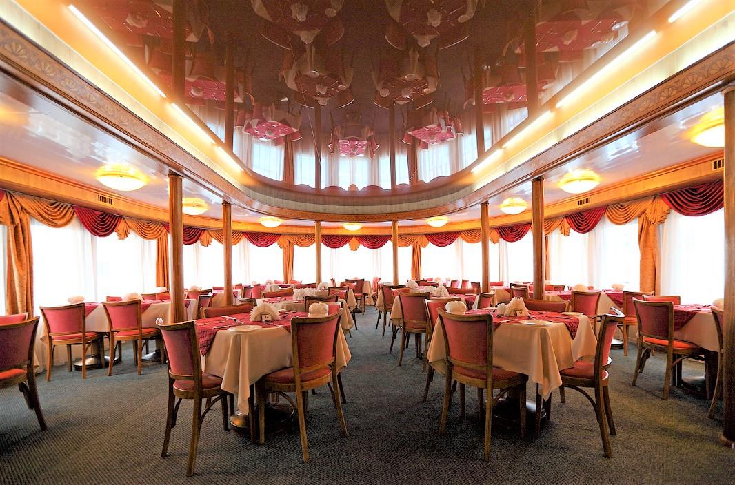Трехразовое питание, включенное в стоимость круиза, проходит в двух судовых ресторанах: малом, расположенном на шлюпочной палубе и основном, расположенном на палубу ниже под ним. Распределение по ресторанам производится в зависимости от категорий кают.