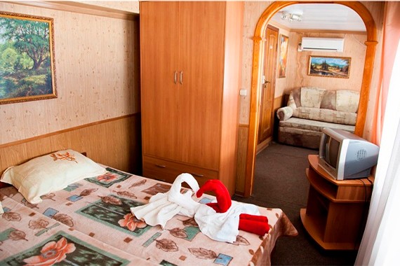 Двухместная каюта увеличенной площади со всеми удобствами, расположенная на шлюпочной палубе. Возможно размещение третьего человека на дополнительном спальном месте - диван. В каюте: двуспальная кровать, диван (600х1800 мм), шкаф, стол, тумба, зеркало, телевизор + DVD, радио, кондиционер, холодильник, розетки 220V, фен, чайник, набор посуды для чая, ванная комната (раковина, душ, туалет), туалетные принадлежности (шампунь, мыло, гель для душа), обзорное окно.