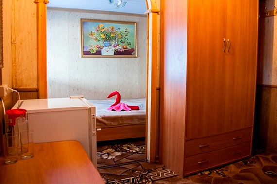 Одноместная каюта со всеми удобствами, расположенная на главной палубе. Возможно размещение второго человека. В каюте: полутороспальная кровать, шкаф, стол, два кресла, полка, радио, холодильник, розетки 220V, ванная комната (раковина, душ, туалет), туалетные принадлежности (шампунь, мыло, гель для душа), два обзорных окна.