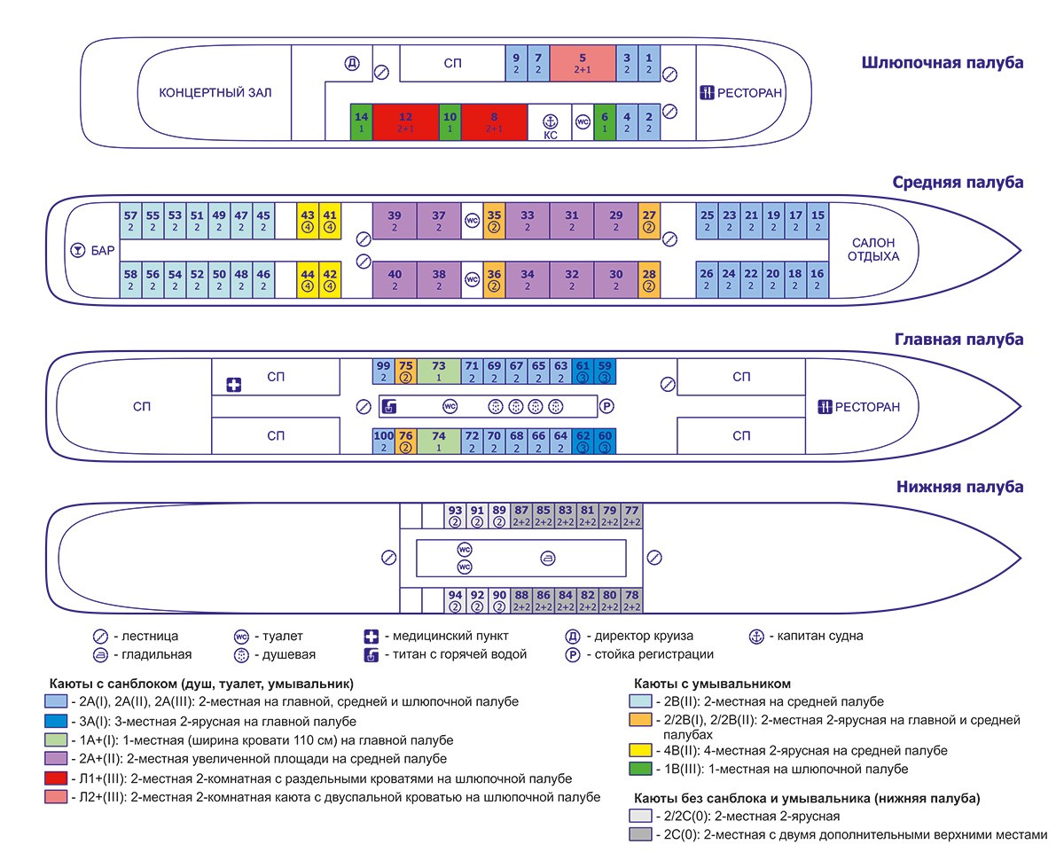 Для размещения туристов на теплоходе имеются каюты разной категории комфортабельности: без удобств (на нижней палубе); с умывальником; со всеми удобствами (душ, туалет, раковина). Есть несколько кают категории «Люкс», а также 1-, 2-, 3-, 4-местные каюты. Многие каюты оборудованы дополнительными местами. К навигации 2023 прошла реновация пассажирских кают на главной и средней палубах, обновление внутренней отделки, мебели и санузлов. А также производится улучшение общих и технических помещений теплохода.