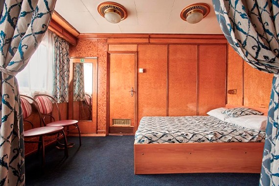 Каюты теплохода рассчитаны на одного, двух или четырех человек. Есть апартаменты как эконом-класса, так и уровня «Люкс», где есть большая двуспальная кровать, диван, туалетная комната с душем и все необходимое для комфортного проживания.