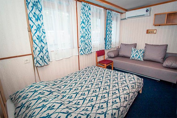 Двухместная каюта со всеми удобствами, расположеная на срадней палубе. Площадь каюты от 8 до 9 м . Возможно размещение ребенка на дополнительном спальном месте - диван. Мини-бар за дополнительную плату. В каюте: две односпальные кровати, диван, шкаф для одежды, настенная полка, Smart TV, кондиционер, холодильник, мини-бар, стол и стул, зеркало, радио, розетка, ванная комната (раковина, душ, туалет), два обзорное окна.