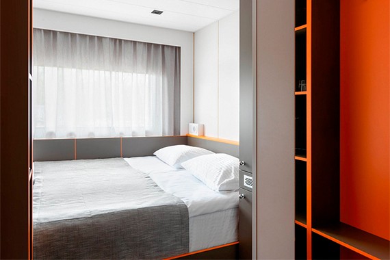 Двухместная каюта со всеми удобствами. Площадь каюты от 10,3 до 15,5 м². Размер кровати – 160х200 см. В каюте: двуспальная кровать, ванная комната (раковина, душ, туалет), шкаф для одежды, сейф, радио, телевизор, кондиционер, холодильник, фен, туалетные принадлежности, тапочки, розетка 220V, обзорное окно.