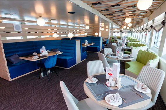 Круиз на теплоходе включает 3-х разовое питание по заказному меню с элементами шведского стола: салатная станция на обед и ужин, хлебная на каждый приём пищи. Для маленьких путешественников – специальное детское меню. На каждый завтрак подается игристое, а на обед и ужин бокал вина, пива или стопка водки на ваш выбор. В круизе проводятся специальные ужины: Приветственный (с дополнительным бокалом игристого и фирменным десертом) и Капитанский (с горячим из меню, закусками и фирменным десертом). На борту работает кондитерская с десертами, сэндвичами и кофе.