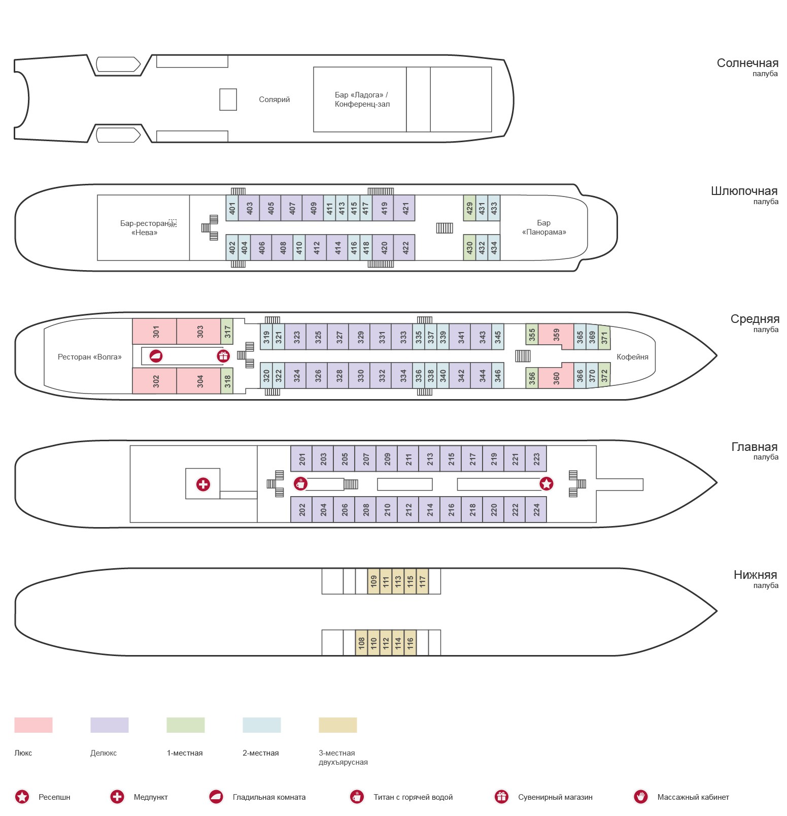 Двухместная каюта со всеми удобствами, расположенная на средней палубе. Площадь каюты ≈ 15,5 м². Размер кровати – 160х200 см. В каюте: двуспальная кровать, ванная комната (раковина, душевая кабина, туалет), шкаф для одежды, кресло, пуфик, сейф, радио, телевизор, кондиционер, холодильник, фен, туалетные принадлежности, халаты, тапочки, розетка 220V, обзорное окно.