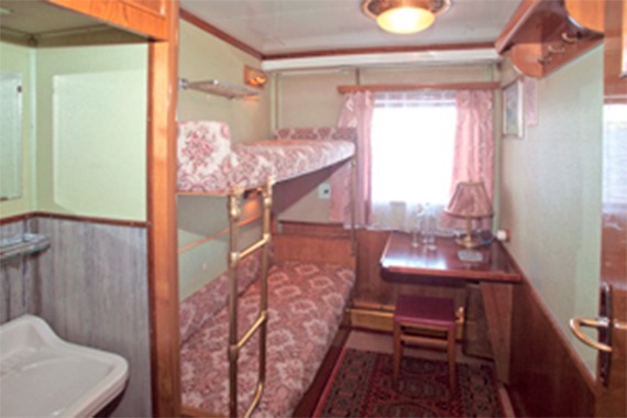 Главная палуба. 2-х местная, двухъярусная, умывальник (холодная и горячая вода), настенная вешалка для одежды, радио, эл.розетка, окно, S = 4,5 кв.м.