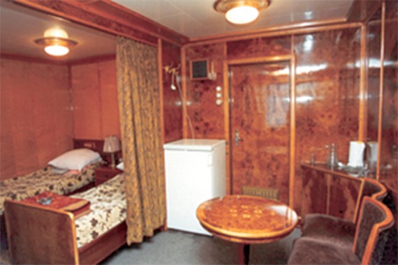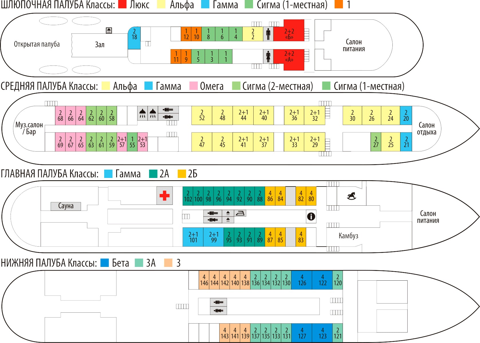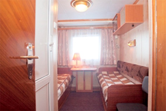 Средняя палуба. 2-х местная, одноярусная, кондиционирование, санузел (умывальник, душ, туалет), раздельные кровати, шкаф для одежды, радио, эл.розетка, окно, S = 7,5 кв.м.