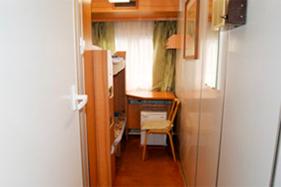 Главная палуба. 4-х местная, двухъярусная, умывальник (холодная и горячая вода), шкаф для одежды, радио, эл.розетка, окно, S = 7 кв.м.