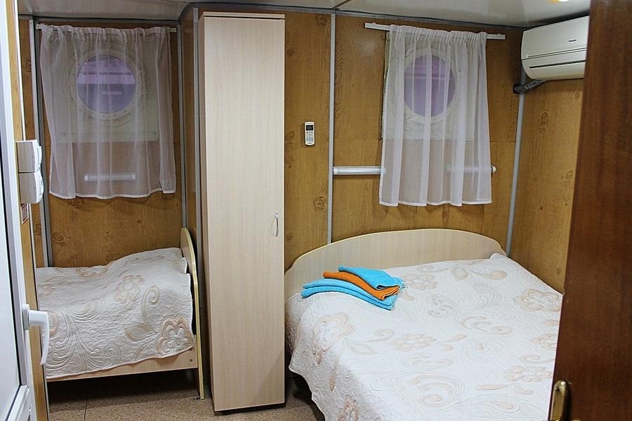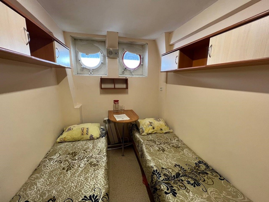 К категории Б2н относятся каюты: 002–012, 017. Двухместная каюта с частичными удобствами, расположенная на нижней палубе. В каюте: две односпальные кровати, раковина, столик.