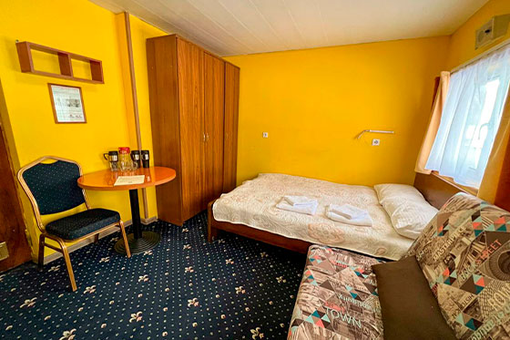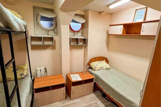 К категории 1-местная (нижняя палуба) относится каюта: 001. Одноместная каюта с частичными удобствами, расположенная на нижней палубе. В каюте: кровать, дополнительное место (кровать), раковина с горячей и холодной водой, столик.