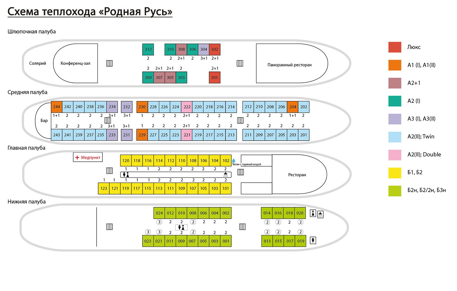 К категории Б2 относятся каюты: 101–114. Двухместная каюта с частичными удобствами, расположенная на главной палубе. В каюте: две кровати, раковина с горячей и холодной водой, мини-холодильник, кондиционер, телевизор, столик, шкаф.