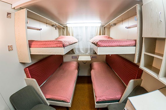 Четырехместная двухъярусная каюта со всеми удобствами, расположенная на нижней палубе. В каюте: две односпальные кровати и два спальных места верхнего расположения, шкаф, настенная полка, стол, два стула, кондиционер, холодильник, ванная комната (раковина, душ, туалет), радио, телевизор с кабельным и спутниковым вещанием, фен, плед для каждого туриста, щетка для одежды, розетки 220 V, иллюминаторы.