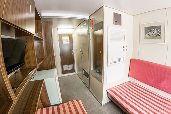 Одноместная каюта со всеми удобствами, расположенная на шлюпочной палубе. В каюте: кровать, шкаф, стол, настенная полка, холодильник, ванная комната (раковина, душ, туалет), радио, кондиционер, телевизор с кабельным и спутниковым вещанием, фен, плед, щетка для одежды, розетки 220 V, обзорное окно.