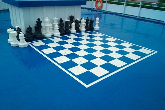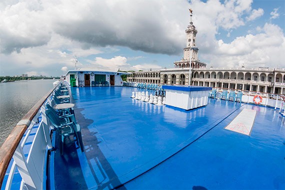 К услугам любителей игр на свежем речном воздухе – целое игровое поле на верхней палубе теплохода. Здесь можно воспользоваться гигантскими шахматами, напольными шашками. Также на игровом поле можно будет сыграть и в «шаффлбоард» – увлекательную и простую игру на размеченном поле с использованием специальных киев и шайб. Обширная площадь палубы позволяет прогуливаться и загорать на ней.