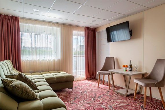 Двухместная двухкомнатная каюта со всеми удобствами, расположенная на шлюпочной палубе. В каюте: двуспальная кровать, прикроватные тумбы, туалетный стол, пуф, двухспальный диван, зеркало, журнальный стол, кресла для отдыха, телевизоры со спутниковым приемом каналов в гостиной и спальной комнатах, кухонный гарнитур, холодильник, шкаф-купе, вешалка для верхней одежды, телефон внутренней связи, ванная комната (раковина, душевая кабина с гидромассажем, туалет), сейф, система раздельного климат-контроля (отдельно для гостиной и спальни), розетки 220 V, фен, радио, плед для каждого туриста, обзорные окна, персональный балкон с мебелью для отдыха.
