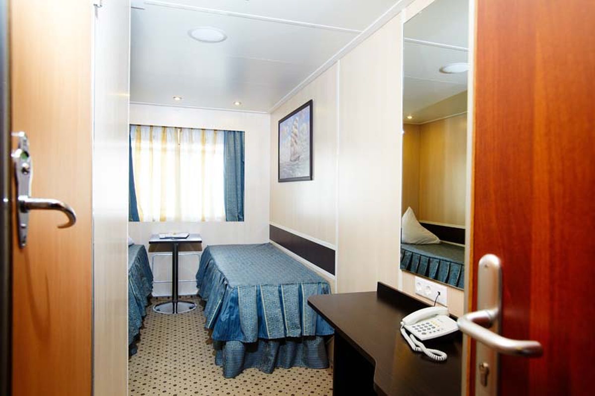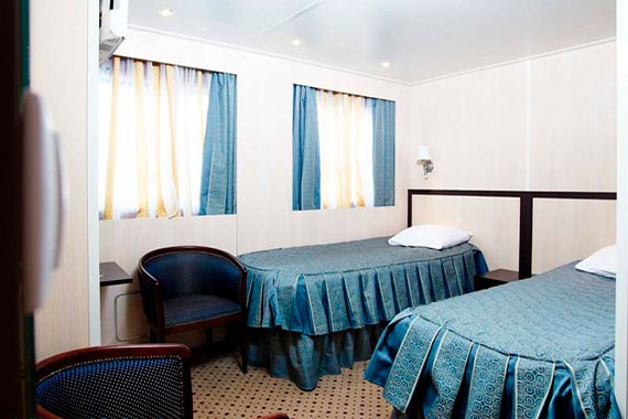 Двухместная одноярусная каюта со всеми удобствами на шлюпочной палубе. В каюте: два спальных места, индивидуальный санблок (умывальник, туалет, душ), кондиционер, телевизор, холодильник, электророзетка 220В. Каюты №: 401-428.