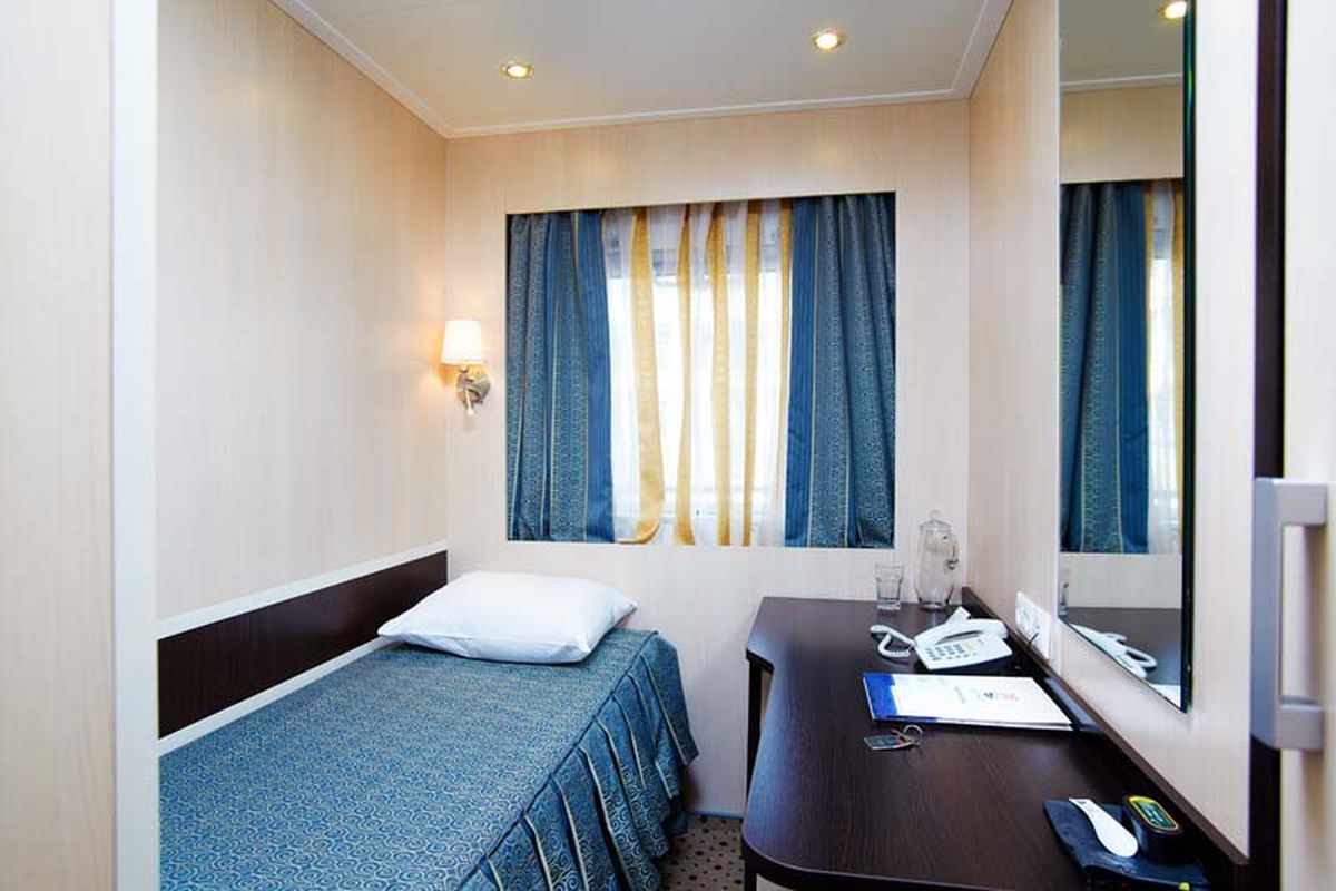 Одноместная каюта со всеми удобствами на средней палубе. В каюте: одно спальное место, индивидуальный санблок (умывальник, туалет, душ), кондиционер, телевизор, холодильник, электророзетка 220В. Каюты №: 309, 310, 347, 348.