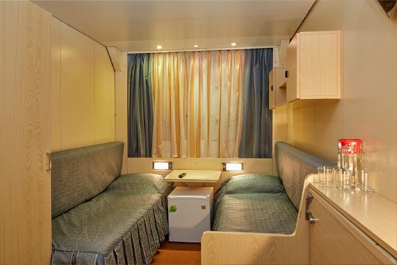 Двухместная одноярусная каюта со всеми удобствами на нижней палубе. В каюте: два спальных места, индивидуальный санблок (умывальник, туалет, душ), кондиционер, электророзетка 220В. Каюты №: 102, 112, 114, 119, 120.