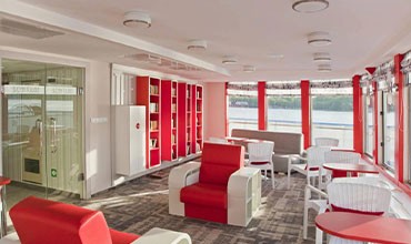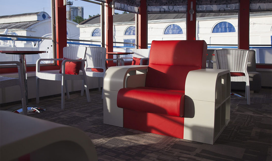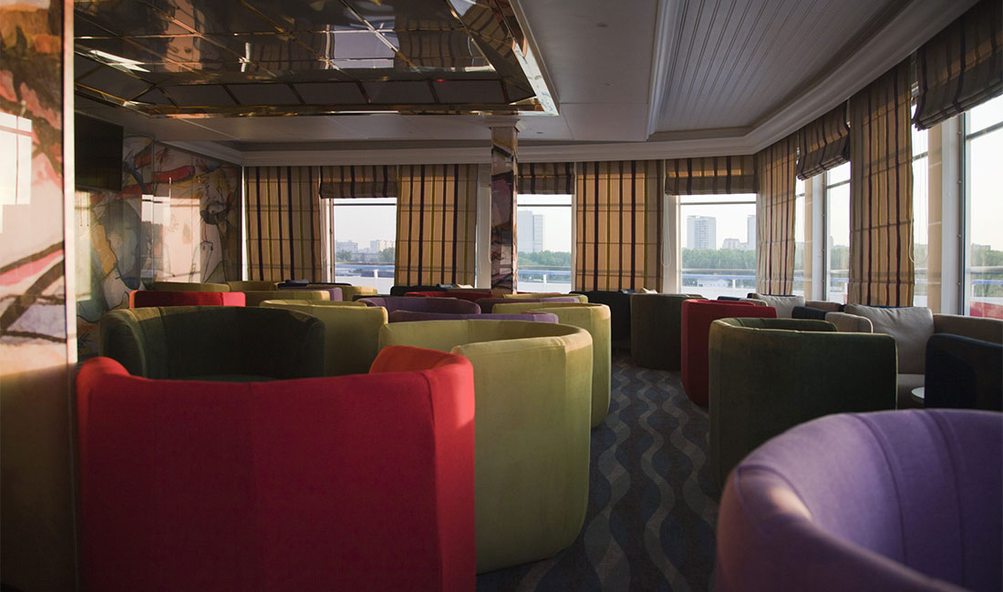 Из окон бара открывается восхитительный вид на реку, а уютные полукруглые кресла располагают к созерцанию природных красот и философским беседам.