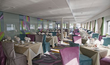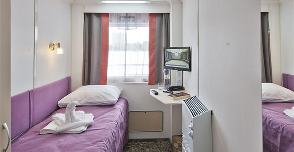 Корабль оборудован 114 комфортабельными каютами с полным набором удобств. Гости могут смотреть телевизор, слушать радио, пользоваться Интернетом без ограничений. В 1- и 2-местных каютах окна открываются.