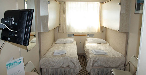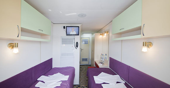 В каюте: два иллюминатора (нельзя отрыть), две двухъярусные кровати, кондиционер, телевизор, сейф, внутренний телефон, душ, санузел, туалетные принадлежности, полотенца. Всего 4 каюты.