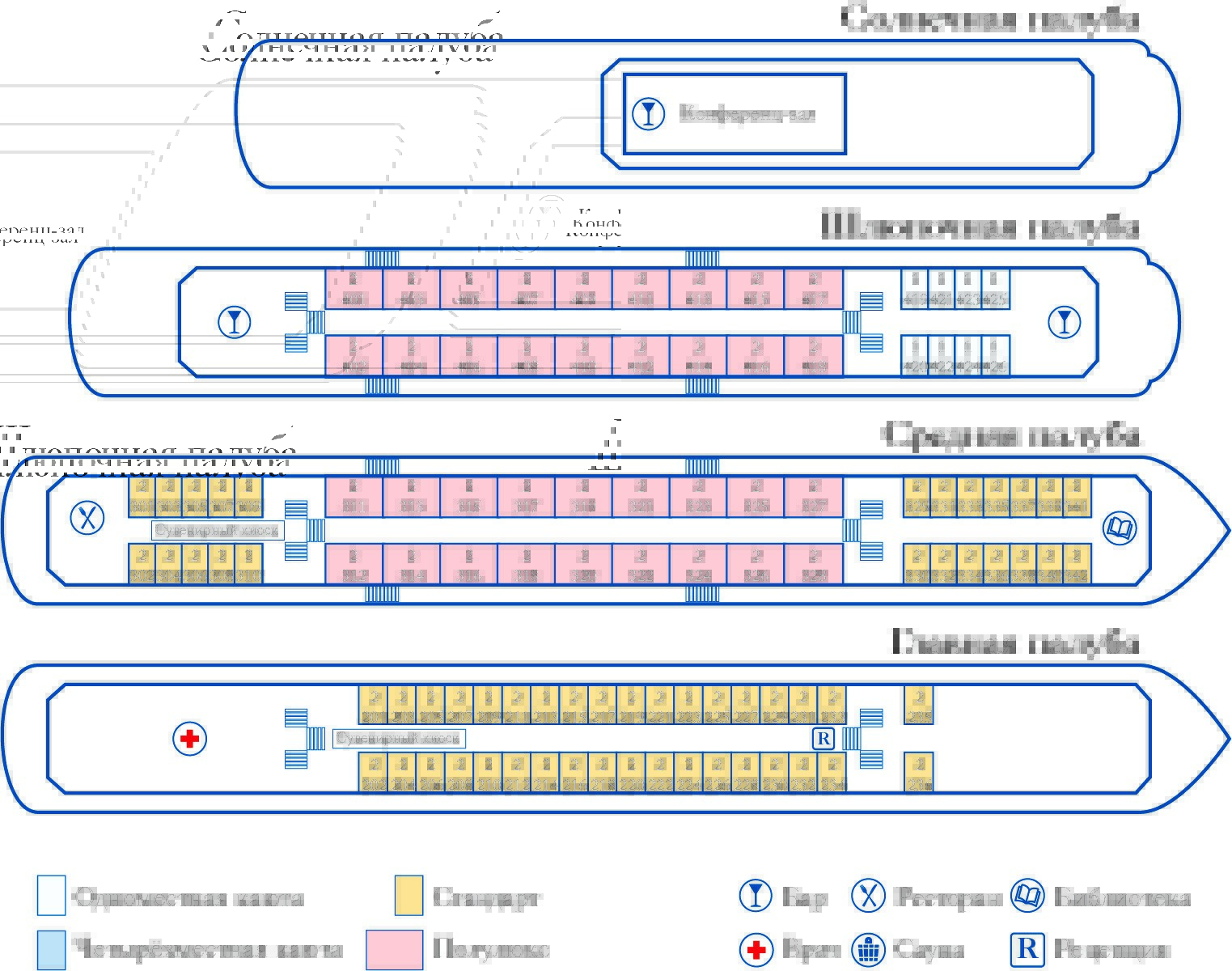 Площадь: 8-9,5 м2. Двухместная каюта со всеми удобствами: большое открывающееся обзорное окно, кровати, кондиционер, телевизор, сейф, внутренний телефон, душ, санузел, туалетные принадлежности, полотенца. Всего 62 каюты.