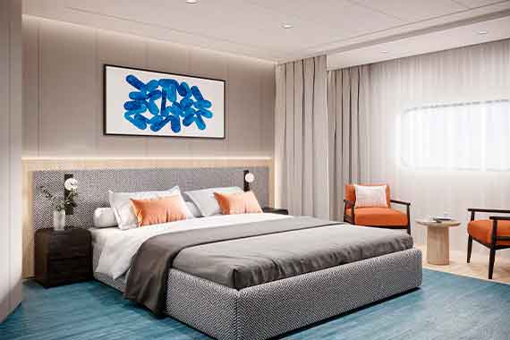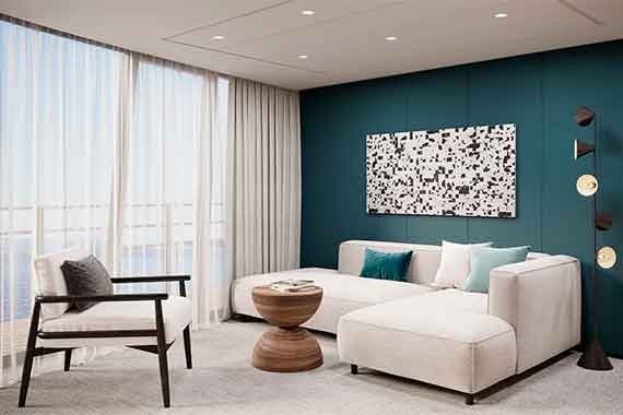 Двухкомнатная, комфортабельная каюта с современным интерьером, балконом и всем необходимым для отдыха В гостиной: диван, кресло, журнальный столик, холодильник, спутниковое ТВ, пуф, шкаф для одежды, телефон, радио, фен, капсульная кофемашина, электрочайник, сейф, балкон. В спальне: двуспальная кровать, прикроватные тумбы, фен, телевизор, панорамное окно, письменный стол, книжный стеллаж, кресло душ, санузел. Балкон: два кресла, кофейный столик.