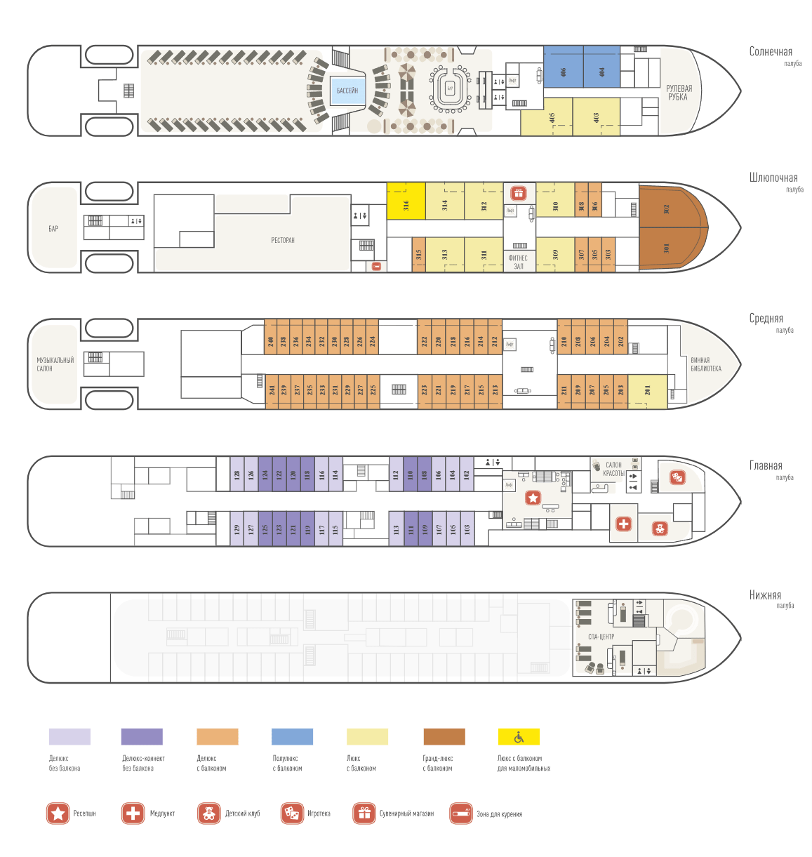 Оформление кают выполнено с использованием премиальных материалов. Эксклюзивный текстиль и удобные кровати помогут расслабиться и насладиться вашим путешествием в полной мере. Во всех каютах: шкаф для одежды, балкон или панорамное окно, кондиционер, душ, санузел, радио, розетка 220V, холодильник, капсульная кофемашина, электрочайник, телевизор (спутниковое ТВ), телефон, сейф, фен.