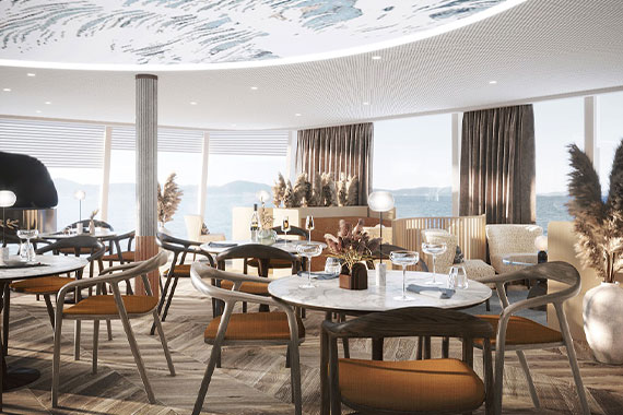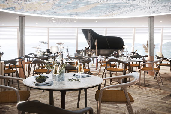 На шлюпочной палубе вы найдете просторный Ресторан, где каждая деталь создана для вашего удовольствия: Основная зона на 172 посадочных места, в которой благодаря остеклению в пол открывается великолепнейшая панорама проплывающих за бортом пейзажей. Веранда на 24 места, где можно наслаждаться гастрономическими вкусами на свежем воздухе. Приватная зона на 8 мест, которая идеально подходит для особого случая или частного мероприятия.