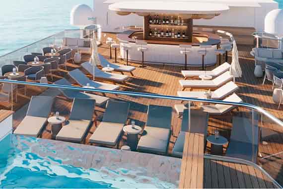 Солярий с шезлонгами, пейзажный бассейн с подогревом, откуда открывается потрясающий вид на закат, а также многофункциональная релакс-зона с барной стойкой 360°. Камерная лаундж-зона возле бара с мягкими диванами. Освежающие коктейли в перерывах между солнечными ваннами.