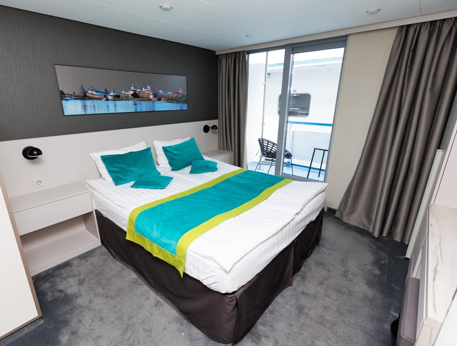 К категории Полулюкс+ с балконом (средняя палуба) относятся каюты: 305, 306, 308, 309, 310, 315, 316, 323, 325, 326. Двухместная каюта с балконом и со всеми удобствами, расположенная на средней палубе. Площадь каюты ≈ 15 м². Площадь балкона ≈ 6 м². Размер кровати – 160х200 см. Доступ к Wi-Fi предоставляется с ограничением трафика. Возможно размещение третьего человека (ребенок до 14 лет включительно) на дополнительном спальном месте – еврораскладушка.