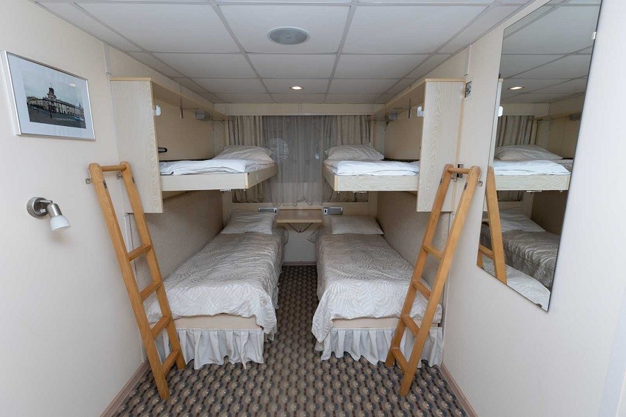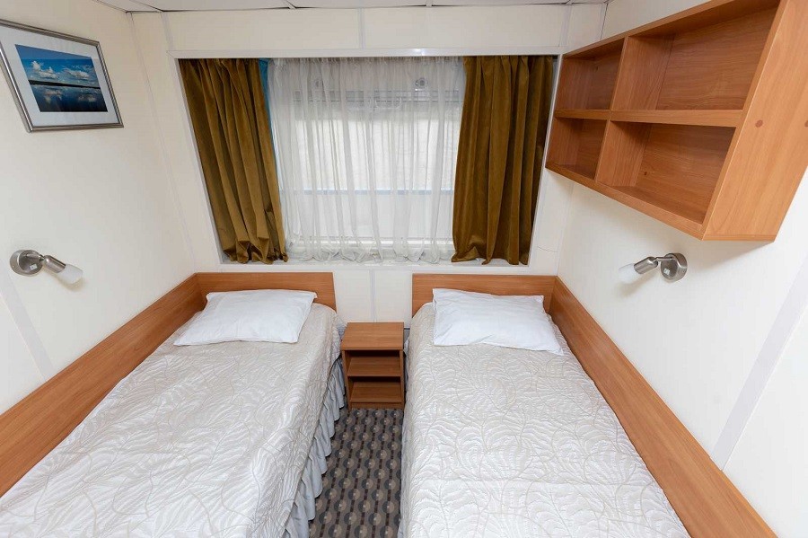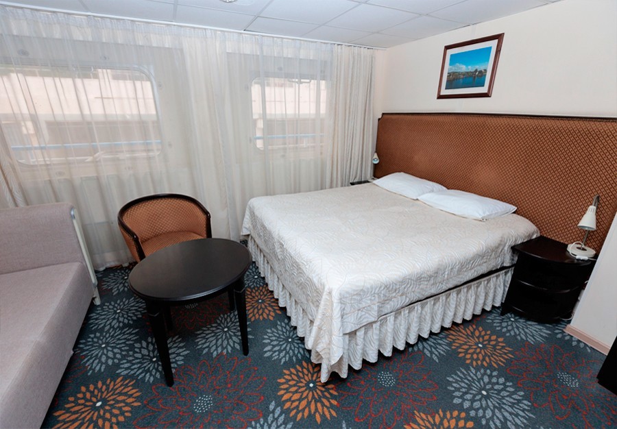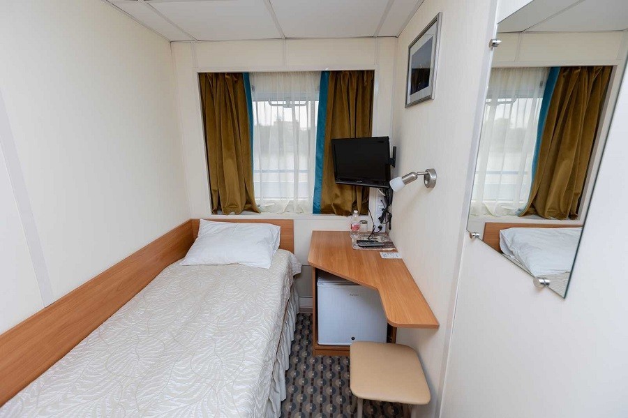 На теплоходе предусмотрены удобные каюты различных категорий — от стандартных до люксовых, оснащённые всем необходимым для комфортного отдыха и полноценного сна во время круиза.