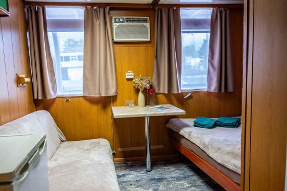 К категории Эконом одноместная (шлюпочная палуба) относятся каюты: 1-12, 14, 16. Одноместная каюта с частичными удобствами, расположенная на шлюпочной палубе. Возможно размещение второго человека на дополнительном месте - раскладной диван. В каюте: раскладной диван, шкаф для одежды, столик, кондиционер, полочка для книг, зеркало, раковина, холодильник, обзорное окно.